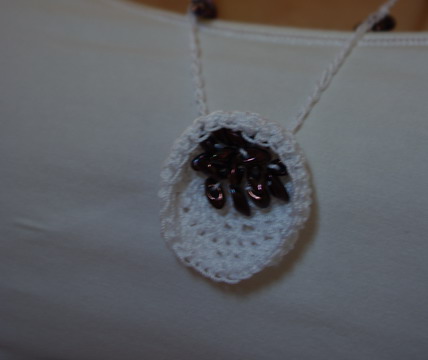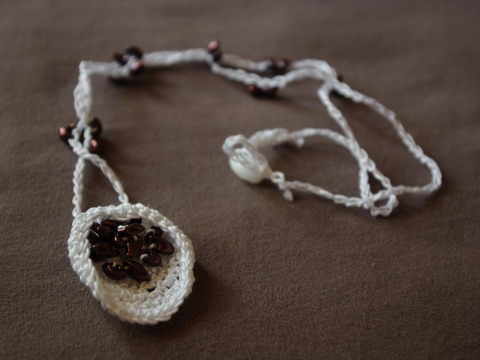 Ezt a nyakláncot teljes egészében horgolással készítettem. Különös fészeknek neveztem el, a fészekszerű kehelyben ücsörgő, irizálóan lila gyöngyöcskék miatt. A lánc részt is horgoltam, időnként pedig gyöngyöket is fogtam a szemek közé. Izgalmas volt figyelni, hogyan alakul egységgé a két egymástól teljesen különböző anyag.