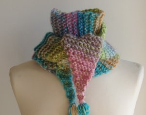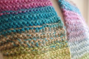 A két vége elkesekenyedik, sőt bojt is került rá. 2x50g ment bele, pont jó a hossza, hogy egyszer körbetekerjem és megkössem. Lusta kötéssel, 6-os tűvel készült.