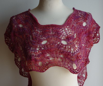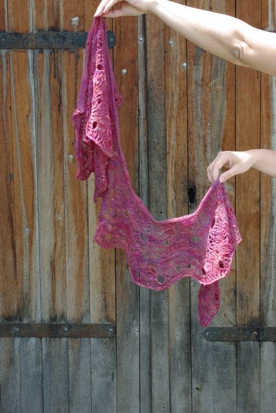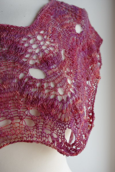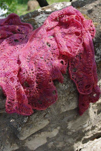 A fonal pedig a színtiszta szerelem: Malabrigo Lace. A sálhoz összesen 42 grammot használtam fel az 50-ből. Jó hosszú, majdnem 400 méternyi egy-egy ilyen gombolyagocska. A színe pedig az 850-es Archangel. Kicsit több benne a lila, mint elsőre hittem, de még így is valami egészen gyönyörűséges színorgia. Lilák, narancsok, pirosak és pinkek folynak és kavarognak egymásban.